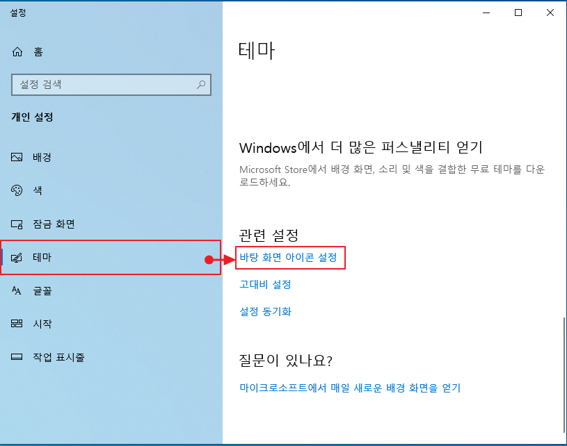- 왼쪽의 테마 클릭 후, 오른쪽 페이지에 활성화되는 바탕화면 아이콘 설정 클릭
